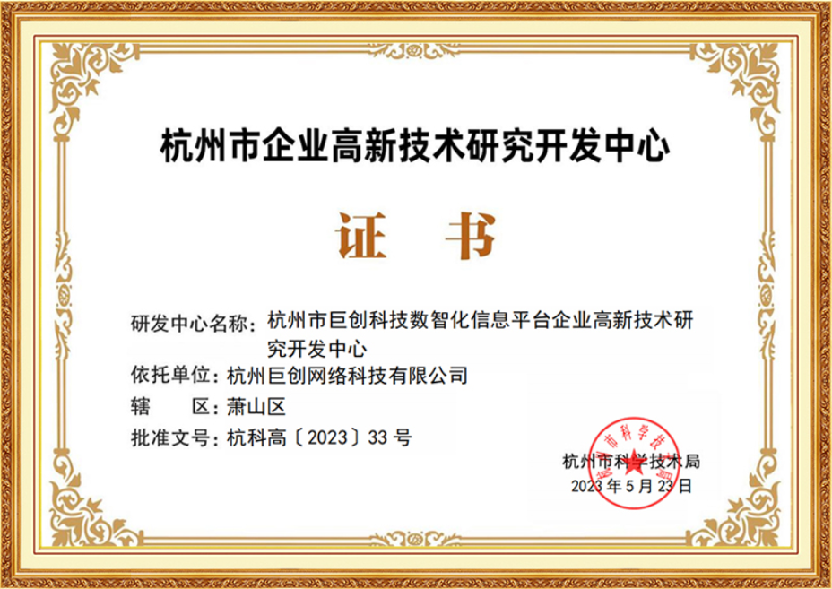 巨创科技成立于 2004 年,是一家具有 21年发展历程的软件研发企业。以助力数字化改革为契机,有效提高企业的研发能力以及核心竞争力,巨创科技与浙江大学、浙江工商大学等多所高校建立产学研究,经过多年的实践与探索,公司拥有200多项自主研发的知识产权。近年,巨创科技荣膺国家高新技术企业、浙江省专精特新中小企业、浙江省高新技术企业研究开发中心、杭州市企业高新技术研究开发中心、入库国家级科技型企业和浙江省创新型中小企业、中国人工智能学会单位会员、浙江省软件企业等。