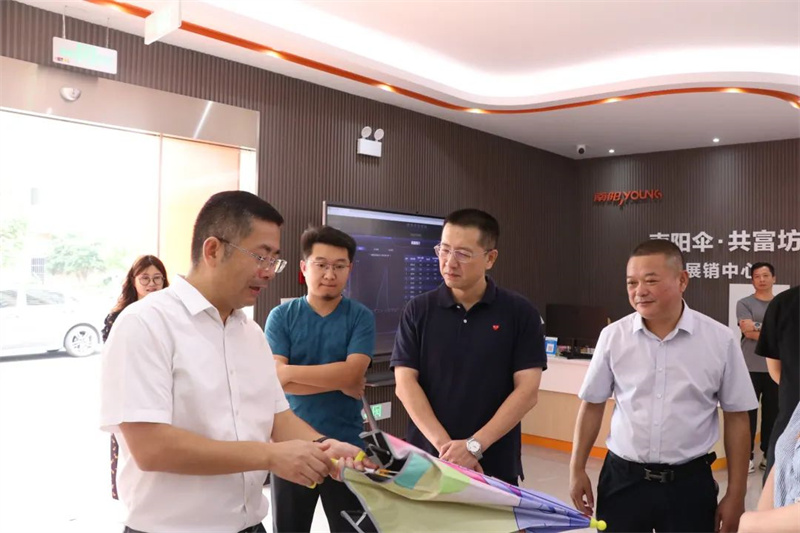 任海锋一行实地调研了南阳伞·共富坊,通过观看巨创科技开发的南阳共富看板了解南阳伞·共富坊的“设计、直播、展销、产业、共富”五大平台运营体系;参观了共富坊的展销中心、样板直播间、缝伞共富区等功能区,了解了共富坊的“1+15+N”的建设模式;并观看了缝伞人缝制伞的工作现场,实地了解了缝伞人如何通过南阳伞·共富坊实现增收。
