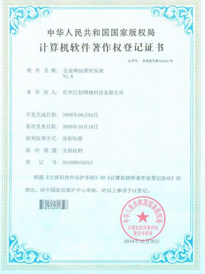 巨创网络科技有限公司面对新的发展时期的激烈市场竞争,根据《计算机软件保护条例》和《计算机软件著作权登记办法》的明文规定,经中国版权保护中心审核,又拿到了《计算机软件著作权登记证书》中的《巨创网上商城系统软件》和《企业巨创网络管理系统》两张证书以及软件评测界定报告。