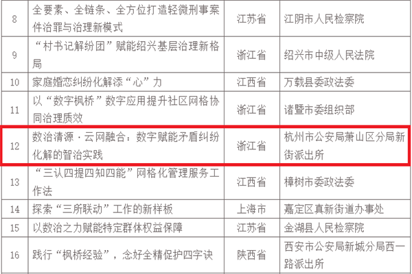 近日,2025年全国新时代“枫桥经验”优秀案例入选名单公示,萧山公安局新街派出所联合巨创科技研发的“矛盾纠纷溯源解分E本账”平台荣获优秀案例奖。